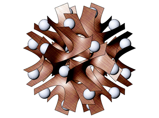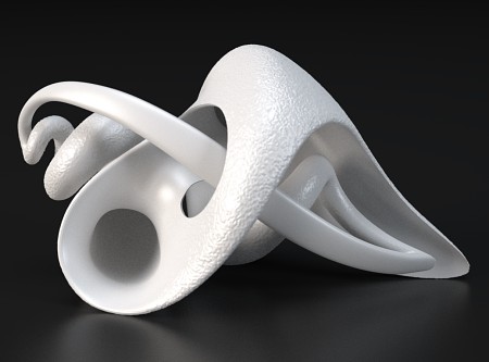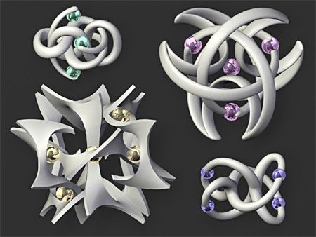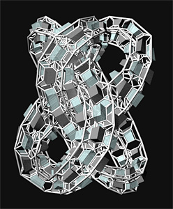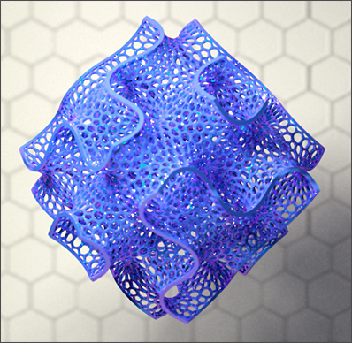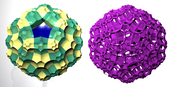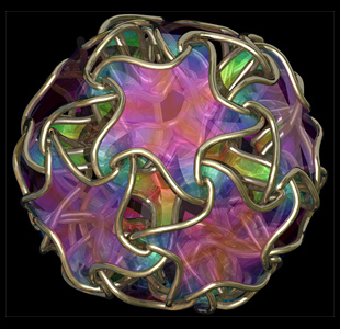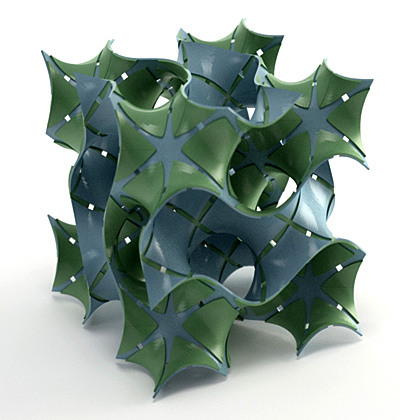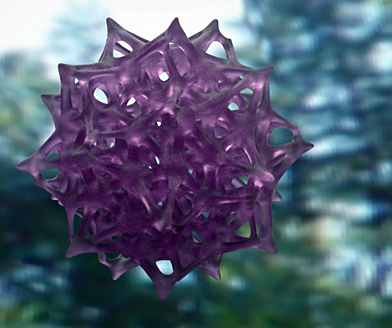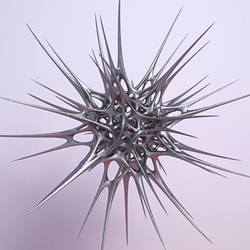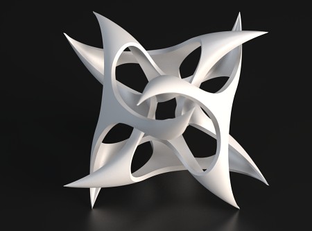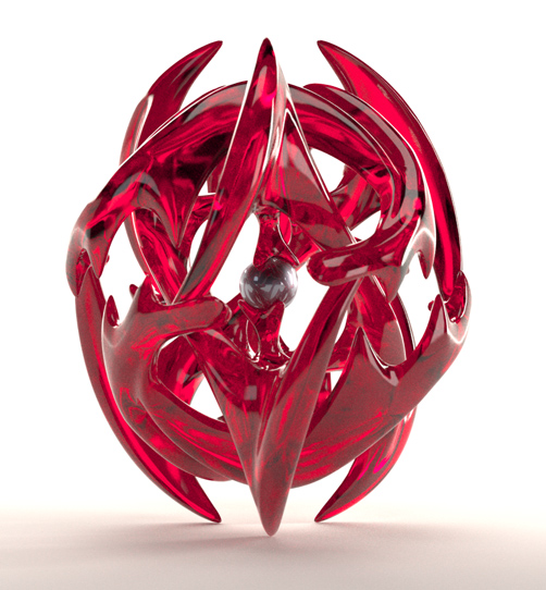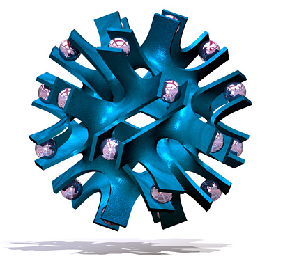 Here's another Maxwell render. To make this model I started with a group of points arranged around a snub cube, then used Qhull to find their Voronoi cells. I wrote some little programs in Perl to give thickness to the Voronoi lattice, then used ZBrush and Surface Evolver to subdivide and smooth the thickened mesh. I don't know what I'll ever do with this model other than render it, but it was such an odd grab bag of tools that I thought the process deserved a note.
