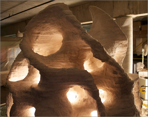 There's a crowdfunding project afoot to print this piece 6' tall, in a white cementlike material made by the D-Shape. The sculpture will have to be shipped from Italy to Vancouver, but there'll be no problem packing it: we just print a crate right around it. But only if you contribute! I did. An architectural-scale 3D printer. Sometimes, just for a minute, this feels like the future.