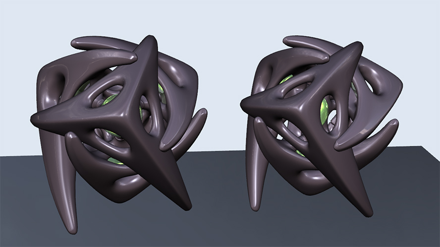 A new biomorphic design. There is a dodecahedral structure underlying this, but it's not very easy to visualize what's going on in there. This makes me nervous so I rendered it cut in half to get a better look.