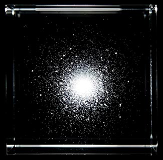 This sculpture is a many-body simulation tuned to match M13, a famous cluster in Hercules. Among its stars there's a sprinkle of larger points representing red giants and horizontal branch stars, showing their concentration near the cluster's center.