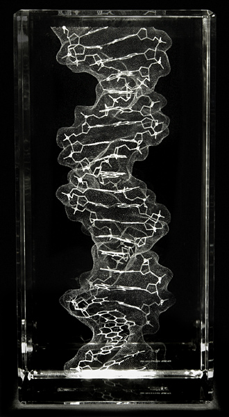 This large DNA model shows the molecular surface, phosphate backbone, bases and h-bonds with unparalleled clarity. At 2 3/4" square by 6" tall it's over 5 pounds of glass, and it makes a scientific statement – this is one big molecule.
