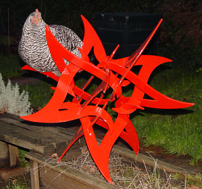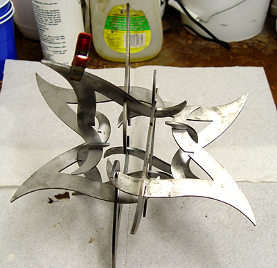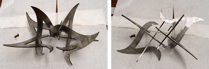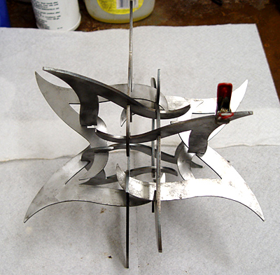 I found it difficult to spray-paint small versions of this object because of the many inward-facing surfaces. The smaller steel ones I painted by brushing on Rustoleum prime and paint. The larger steel one was made by a fabricator (Valley Design in Minnesota, they did a great job!) and it was powder-coated.