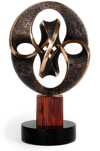 Antichron's elegant symmetry – it has the group consisting of the three half rotations around each axis – make it a favorite with mathematicians and laity alike. This instance is bronze mounted on marble and cocobolo wood.