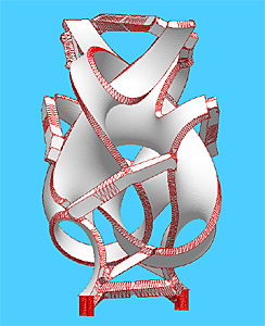 Guessing that the sculpture might be at or near a minimal-energy surface, I set Evolver to work on minimizing the energy of the jagged model. The result is above left: as the surface approaches minimal energy, it also approaches the sculpture. It was quite eerie to watch, as the piece pulled itself into shape without human intervention.