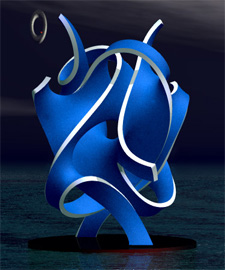 Of course, now that I see the piece offscreen for the first time, revisions are required. At right above is a snapshot from Evolver, showing the piece with its supports in place. I've added these supports because I'm ready to move towards a model for bronze casting, and it must not break before it gets to the foundry.