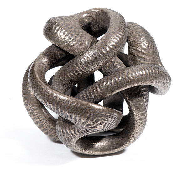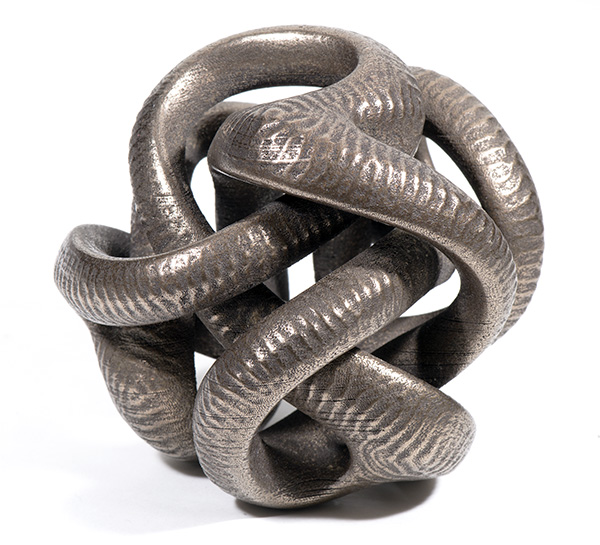 An algorithmic sculpture with a reaction-diffusion texture. Often described as ophidian.